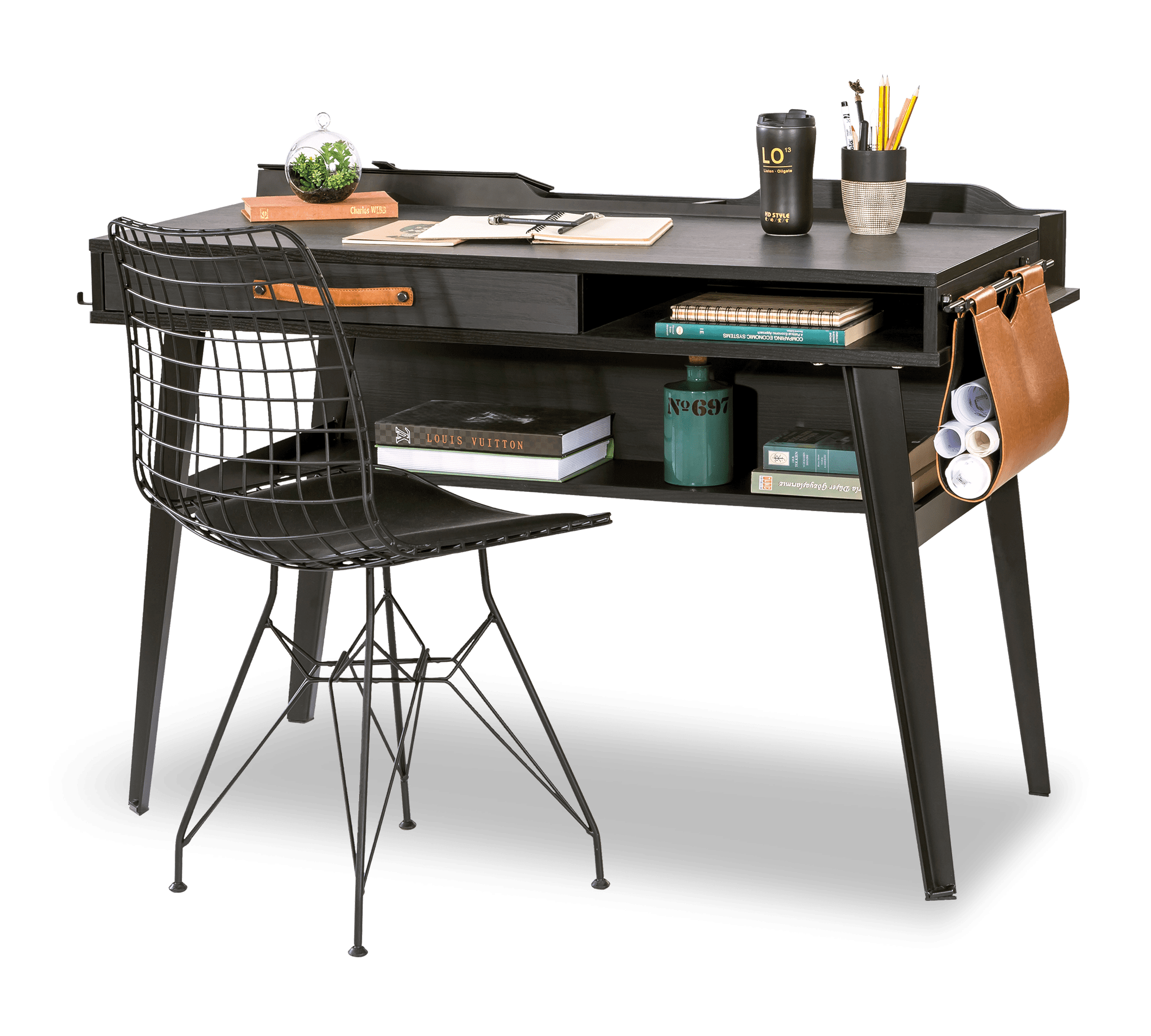 Biroul Dark Metal adaugă un mediu de lucru unic camerelor pentru copii. Rafturile de sub modul permit un spațiu ordonat, în timp ce stația USB facilitează utilizarea dispozitivelor electronice. Picioarele metalice pe care este așezat corpul asigură stabilitatea și durabilitatea mesei. Geanta din piele și mânerul de pe sertar creează o uniune armonioasă din punct de vedere estetic.