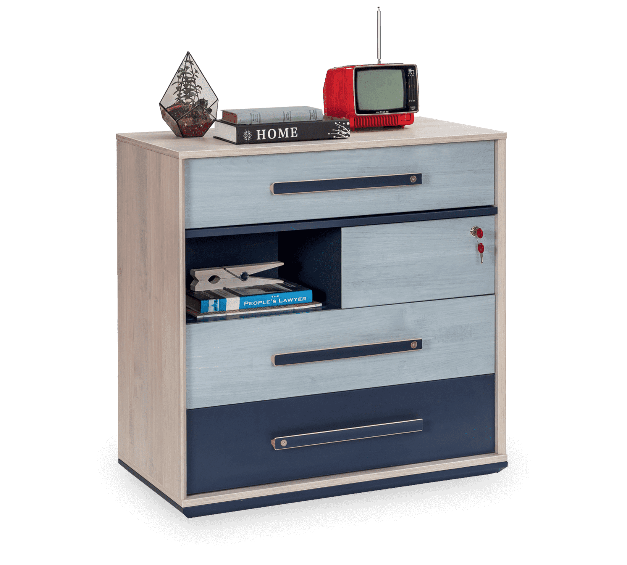 Comoda din gama Trio cu design simplu și modern, în culori armonioase dispune de 4 sertare, dintre care unul cu incuietoare.
