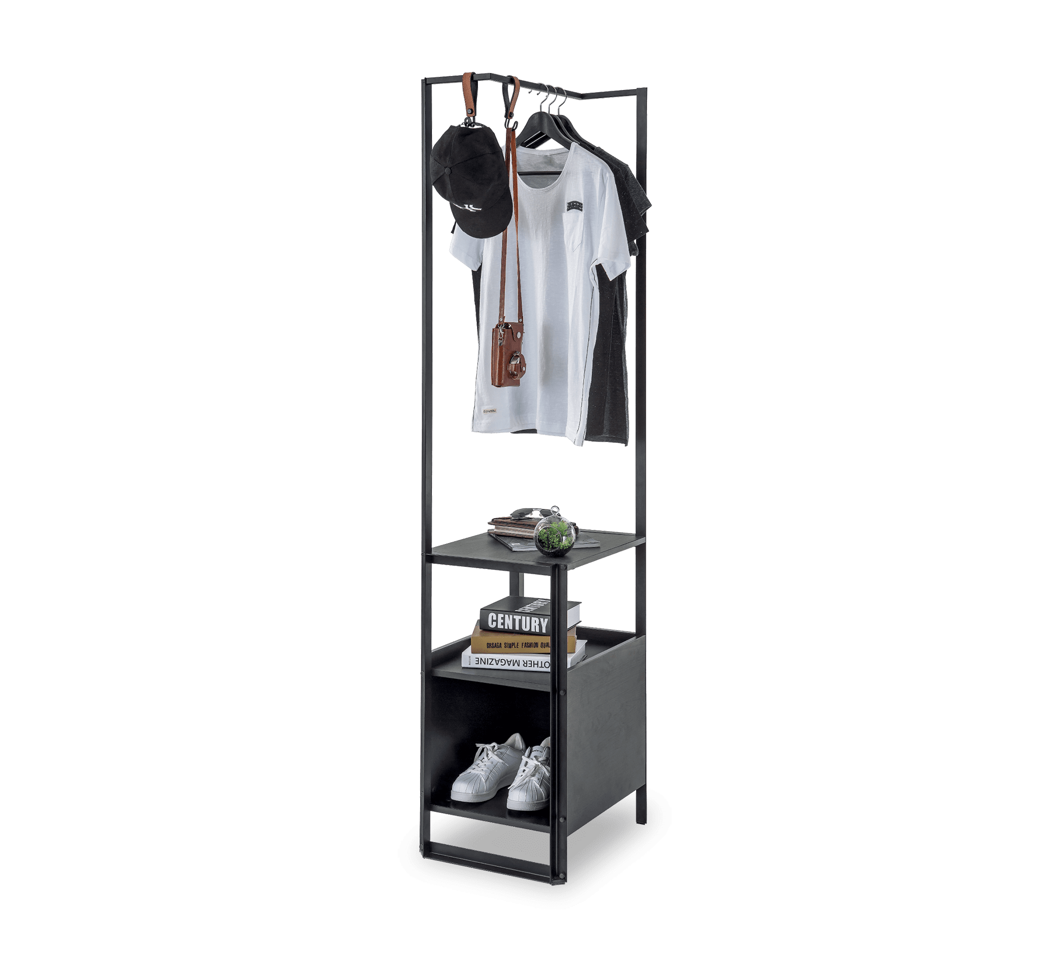 Etajera Dark Metal, din metal negru cu dungi dinamice, se remarcă prin designul său funcțional. Rafturile oferă un spațiu amplu de depozitare pentru articole precum reviste, cărți, caiete și dosare. Partea superioară a rafturilor poate fi utilizată pentru a afișa suveniruri, în timp ce umerașul pentru haine este ideal pentru organizarea tricourilor, șepcilor, jachetelor și genților.