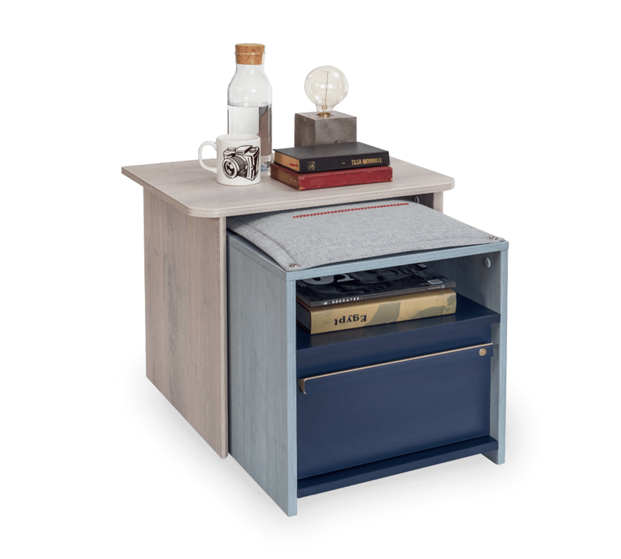 Noptieră cu design modern, din gama Trio, potrivită pentru spațiile înguste. Poate fi împărțită în două si are o pernă moale pentru scaun.