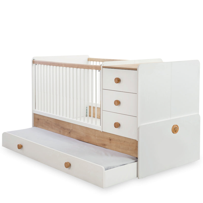 Pat pentru bebeluși care oferă o funcționalitate sporită datorită patului cu roți, din partea inferioară, destinat părintelui, și deschiderii largi de deasupra sertarelor, unde puteți schimba scutecul bebelușului fără a vă îndepărta de pat. Mai mult, atunci când copilul dumneavoastră crește, puteți spori dimensiunea patului adaugând la acesta spațiul alocat inițial sertarelor. Pentru siguranța copilului, colțurile mobilierului sunt rotunjite.